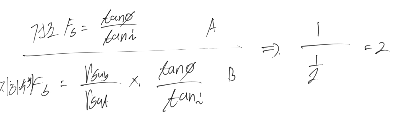문 2. 그림 A와 같은 무한 비탈면에 많은 강우가 내려 비탈면의 상태가 그림 B와 같이 바뀌었다. 그림 B의 비탈면 안전율에 대한 그림 A의 비탈면 안전율의 비(그림 A의 안전율/그림 B의 안전율)는?