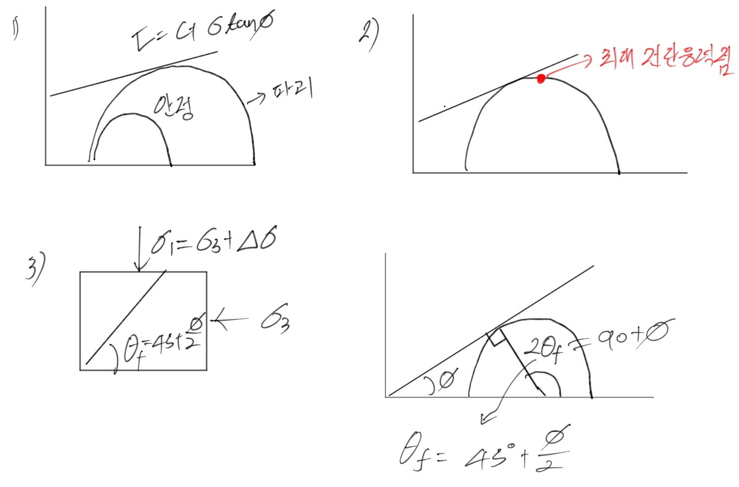 2) 개소리다. CU시험에서 파괴포락선은 최대전단응력점에 접하지 않는다. 그림 2)를 보면 최대저항력보다 작은곳에 접한다.(기하학적으로 판단하는게 쉽다)