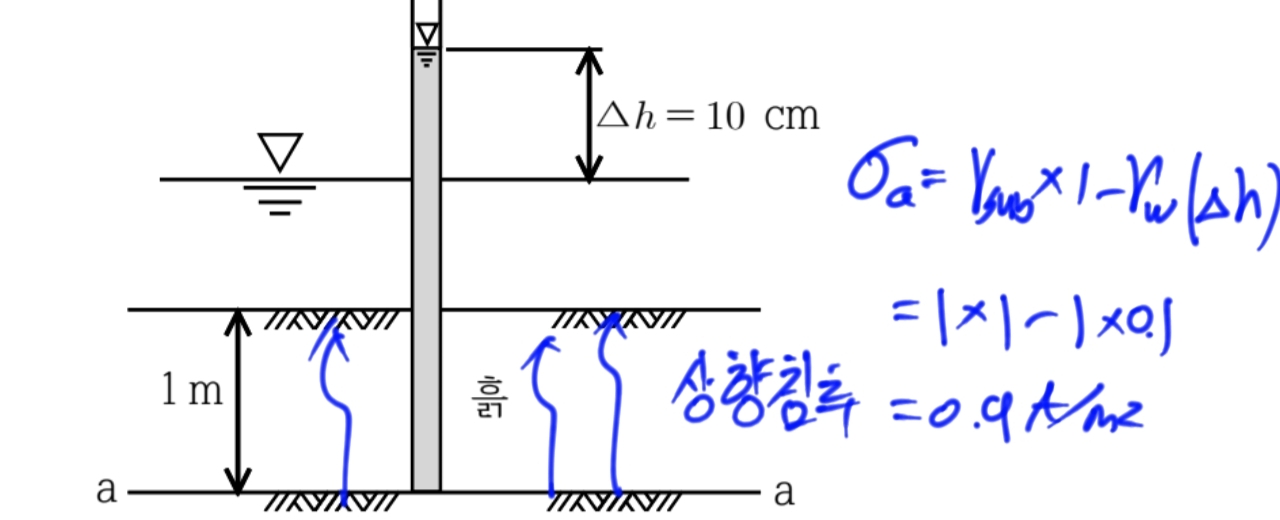 상향침투가 발생하면 유효응력이 감소한다는 것이다. 왜 인지는 알아서 생각해봐..