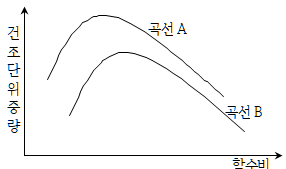 ③ 다짐에너지가 동일할 경우, 곡선 A가 곡선 B보다 더 많은 조립분을 함유하고 있다.