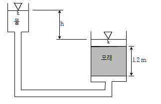 문 9. 다음 그림과 같이 왼쪽에는 물이 담겨있는 수조, 오른쪽에는 모래가 담겨있는 토조가 있다. 분사현상이 발생되기 시작하는 수조와 토조 사이의 수위차 h[m]는? (단, 흙의 포화단위중량은 20kN/m³, 물의 단위중량은 10kN/m³이다)