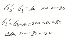 문 20. 포화점토 시료에 대해 비압밀비배수(UU) 시험을 실시하였다. 구속압력 σ3을 100kPa로 작용하였더니 파괴시 간극수압이 20kPa이었다. 이 포화점토에 구속압력 σ3을 200kPa로 작용시켰다면 파괴시 간극수압[kPa]은?