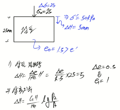 문 18. 압밀시편 두께가 25mm인 점토에 연직응력(σ0)을 25kPa 작용시켰을 때 간극비(eo)는 1.5이었다. 이 시편에 25kPa의 응력을 증가시켜 연직응력(σ1)이 50kPa이 되었을 때 5mm의 침하가 발생하였다. 이때 점토의 간극비(e1)와 압축지수(Cc)는?