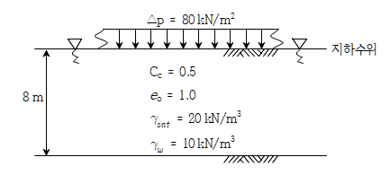 문 19. 다음과 같이 8m 두께의 포화점토 지반에 80kN/m²의 무한 등분포하중이 작용한다. 1년 경과 후 60cm의 침하량이 발생하였다면 압밀도[%]는? (단, 점토지반은 정규압밀점토이고, 압축지수 Cc는 0.5, 간극비(eo)는 1.0, 물의 단위중량γw은 10kN/m³이며, 지하수위는 지표면에 위치한다. 또한, 침하량 계산시 단일층으로 가정하고, log2=0.3, log3=0.5 이다)
