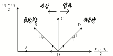 2) OB방향은 인장이 맞다. 왜냐하면 OB방향은 σ1-σ3값이 +인데 σ3가 (-)가 되어야 +값을 가지고