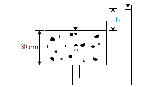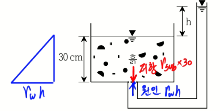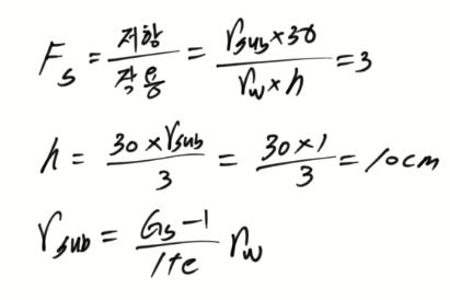 문 7. 그림과 같은 장치에서 분사현상에 대한 안전율이 3이 되려면 h[cm]는? (단, 흙의 비중은 2.65, 간극비는 0.65이다)