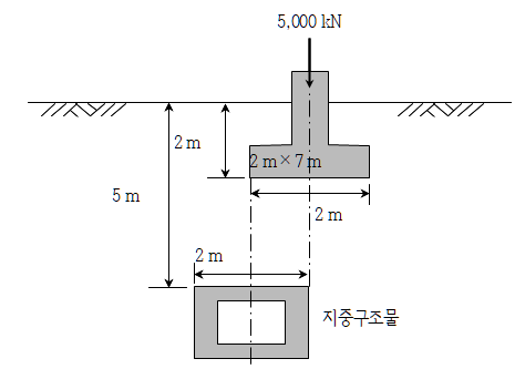 문 15. 그림과 같은 독립기초(폭 2m, 길이 7m)에 작용하는 5,000kN의 하중으로 인해 지표면 아래 5m에 위치한 지중구조물 단면 상부에 야기되는 수직응력[kN/m²]은? (단, 2:1분포법을 사용하여 산정한다)