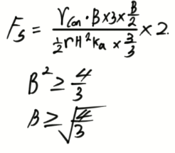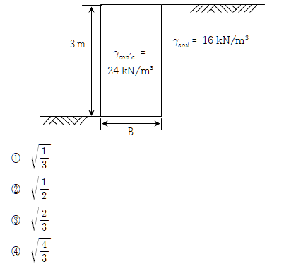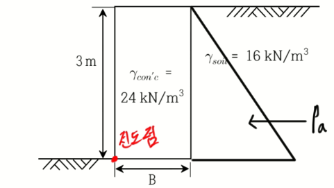 문 10. 그림과 같이 폭이 B로 일정하고 높이가 3m인 옹벽을 세우고자 한다. 전도에 대한 안전율을 2로 적용할 경우, 옹벽의 최소폭 B[m]는? (단, 흙의 단위중량은 16kN/m³, 콘크리트의 단위중량은 24kN/m³, 주동토압계수는 1/3 이다)