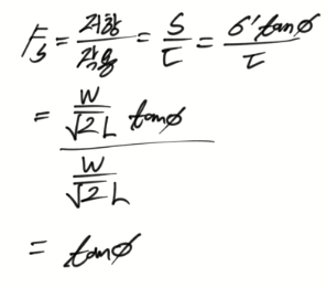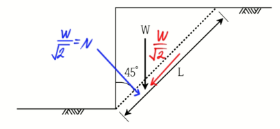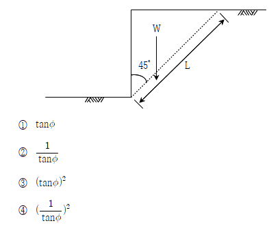 문 8. 그림과 같이 기울기 45도의 전단파괴면을 갖는 연직사면의 안전율은? (단, 단위폭당 파괴쐐기의 무게는 W, 단위폭당 전단파괴면의 면적은 L, 연직사면을 구성하는 토체의 점착력은 0, 내부마찰각은 Φ이다)