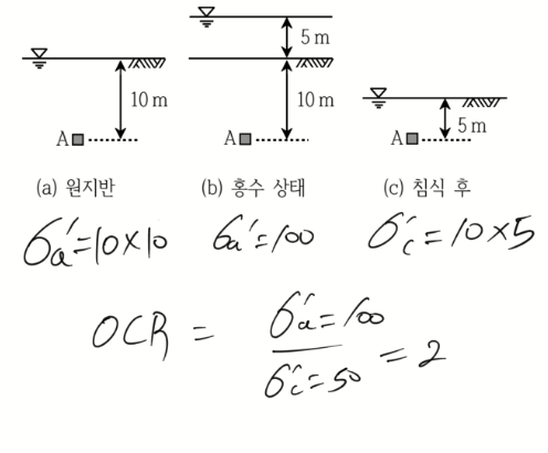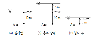 문 14. 지표면에 수위가 위치하던 원지반[그림 (a)]이 홍수로 인하여 수위가 지표면에서 5m까지 증가[그림 (b)]하였다가, 홍수가 끝난 후 5m의 지반침식[그림 (c)]이 발견되었다. 침식 후에도 수위가 지표면에 위치한다면, 홍수상태 [그림 (b)]의 지반요소 A에서의 유효응력은? 또한 원지반 [그림 (a)]이 침식 후 지반[그림 (c)]으로 변화하는 과정에 대한 과압밀비는? (단, 지반의 포화단위중량은 20kN/m³, 물의 단위중량은 10kN/m³를 사용한다)