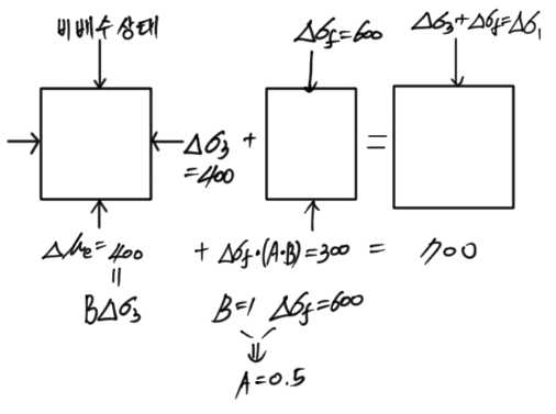 문 12. 삼축압축시험에서 흙 시료를 비배수 상태에서 등방응력 400kN/m²을 가한 후 시료의 과잉간극수압을 측정하니 400kN/m²이었다. 이러한 시료에 등방응력이 400kN/m²인 상태에서 축차응력 600kN/m²을 가했더니 과잉간극수압이 700kN/m²으로 증가하였다. Skempton의 과잉간극수압계수 A 및 B는?