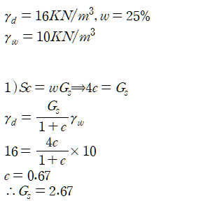 문 3. 완전히 포화된 흙의 건조단위중량과 함수비가 각각 16kN/m³와 25%일 때, 이 흙의 간극비(e)와 비중(Gs)은? (단, 물의 단위중량은 10kN/m³로 가정한다)