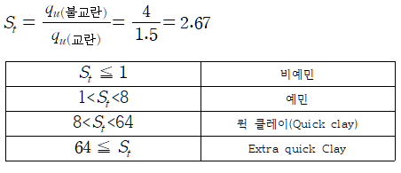 문 1. 자연시료에 대한 일축압축시험 결과 qu=4.0kN/m²를 얻었다. 이 시료를 교란시킨 후 재성형된 공시체로 다시 일축압축시험을 실시하여 qu=1.5kN/m2를 얻었을 때, 이 시료의 예민비는?
