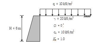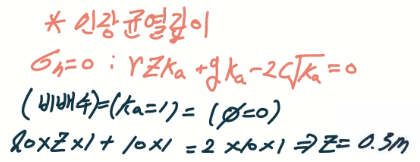 문 15. 그림과 같이 옹벽 배면의 지표면에 등분포하중이 작용하고 있다. 옹벽 배면에 발생하는 인장균열의 깊이[m]는?