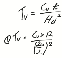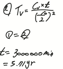 문 13. 10m 두께의 점토층에서 채취한 점토시료를 사용하여 압밀시험(양면배수조건, 시료의 지름 75mm와 높이 20mm)을 수행한 결과 50% 압밀시키는 데 12분이 걸렸다. 만약 이 현장의 배수조건이 실험실 배수조건과 같다면 10m 두께의 점토층이 50% 압밀에 도달하는 데 걸리는 시간[년]은?