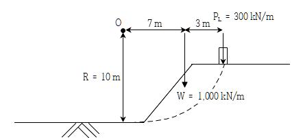 (단, 가상파괴면 원호의 길이는 15m, 흙의 비배수전단강도는 100kPa이고, 모멘트평형법을 사용한다)