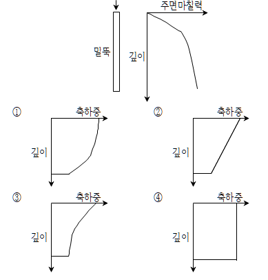 문 20. 말뚝의 단위면적당 주면마찰력은 그림과 같은 분포 형태를 가진다. 이 말뚝두부에 축방향 하중이 작용하였을 때, 축방향 하중전이곡선의 형태와 가장 유사한 것은?