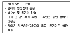 1. 습지나 이끼가 흙속에서 탄소화 되면 만들어짐 2. 건조되면 본 특징이 사라짐 3. 충분히 촉촉할때 사용해야함 4. 통기성 확보, 보수기능 확산 5. 산성이 강하므로 중성화 시켜 사용해야함(석회 등을 섞음) |