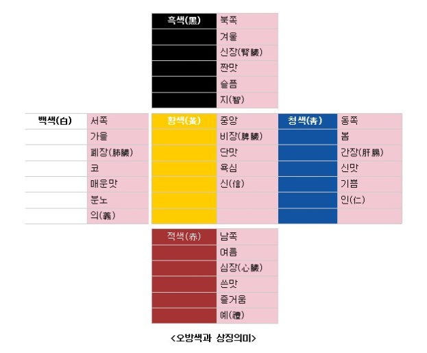 한국의 오방색(五方色)과 방향의 연결 중 “동쪽”에 해당하는 색상은?