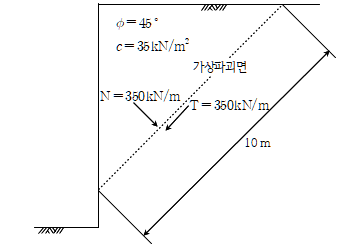 문 1. 그림과 같은 연직사면에서 평면 가상파괴면에 대한 안전율은? (단, N, T는 각각 파괴쐐기 무게에 의한 가상파괴면에 작용하는 수직력 및 활동력이며, 연직사면은 별도의 보강 없이도 자립할 수 있는 것으로 가정한다)