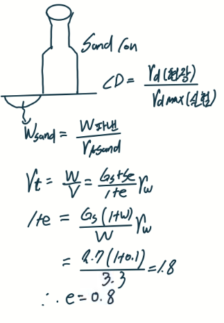 문 3. 모래치환법으로 현장밀도시험을 한 결과 원지반을 파낸 구멍의 부피는 2,000cm³이고 파낸 흙의 중량은 33N이며, 함수비는 10%였다. 이 흙의 간극비는? (단, 이 흙의 비중(Gs)은 2.70이고 물의 단위중량은 10kN/m³이다)