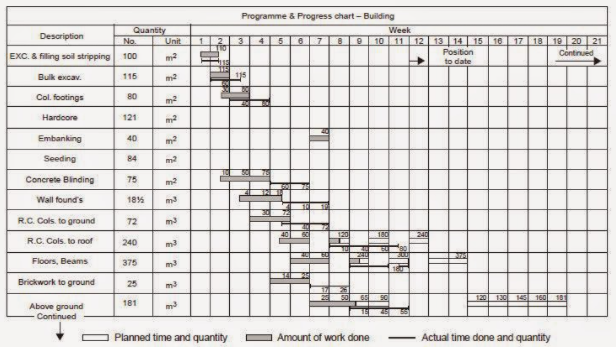 - 사선식 공정표 : 횡선식 같이 작업의 관련성은 없으나 세로축에 전체 시공량을 표시하고 가로축에 공사기간을 기입하여 예정과 실적 파악에 용이하다.
