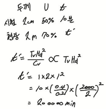 문 10. 두께 2cm인 점토시료에 대한 압밀시험(양면배수) 결과, 평균압밀도 50%의 압밀이 진행되는데 10분(min)이 걸렸다. 동일한 점토층이 자갈층 위에 두께 2m로 놓여있다면(양면배수) 평균압밀도 70%의 압밀이 진행되는데 걸리는 시간[min]은? (단, 현장에서의 초기과잉간극수압 분포는 실내시험과 동일한 것으로 가정하고 평균압밀도 50%와 70%에 해당하는 시간계수는 각각 T50=0.2, T70=0.4로 가정한다)