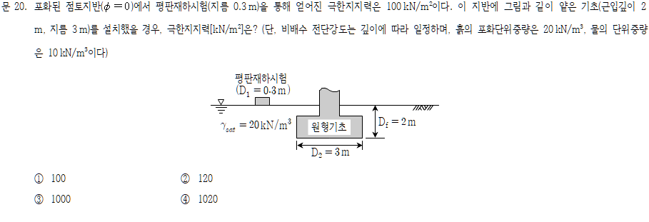난이도 중, 평판재하 시험에서 포화된 점토지반일 경우 극한지지력이 어떻게 될지 알면 쉽다.