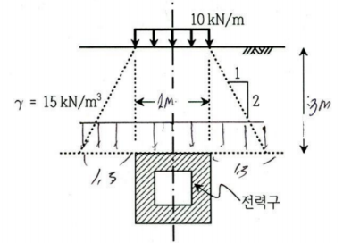 문 9. 그림과 같이 깊이 3m에 종방향으로 매설된 전력구 중심선을 따라 지표면에 10kN/m의 등분포 띠하중이 작용할 경우, 이로 인해 전력구의 윗면에 증가되는 등분포 하중은? (단, 등분포 띠하중과 전력구의 폭은 2m로 동일하며, 띠하중은 지중으로 2:1의 경사로 퍼져 등분포 하중으로 작용한다)