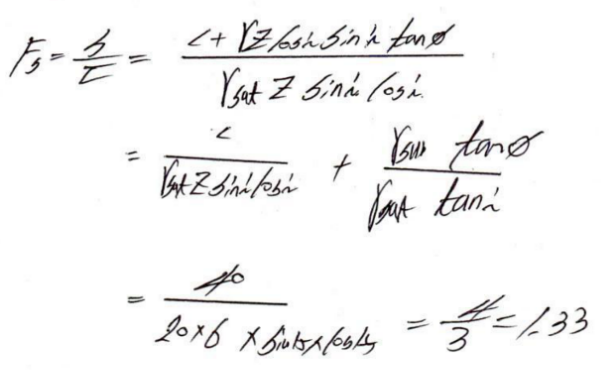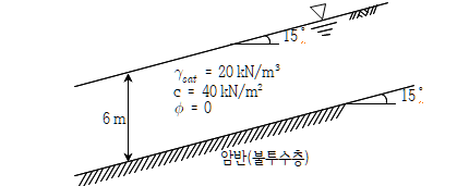 문 14. 그림과 같이 지하수위가 무한사면 지표면에 위치할 때, 무한사면의 안전율은? (단, 물의 단위중량은 10kN/m³이다)