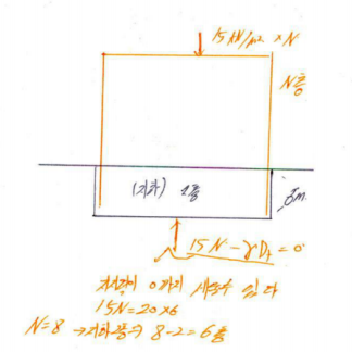 문 5. 단위중량이 20kN/m³인 점토지반 위에 지하 2층까지 주차장을 갖춘 건물을 건설할 때, 보상기초를 적용하여 건설할 수 있는 건물의 최대 층수는? (단, 한 층의 높이가 3m이고, 층당 하중은 15kN/m³이다)