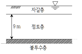 문 2. 그림과 같이 초기간극비가 0.5인 점토층이 자갈층에 의한 압밀종료 후 간극비가 0.3으로 줄었다면 이 점토층에 발생한 최종압밀침하량은? (단, 압밀은 연직방향으로만 발생한다)