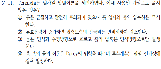 이 세가지가 대표적인 조건이며 특히 압밀에서 Darcy조건이 만족이 되어야 압밀이 된다는 것을 알고 있어야 한다.