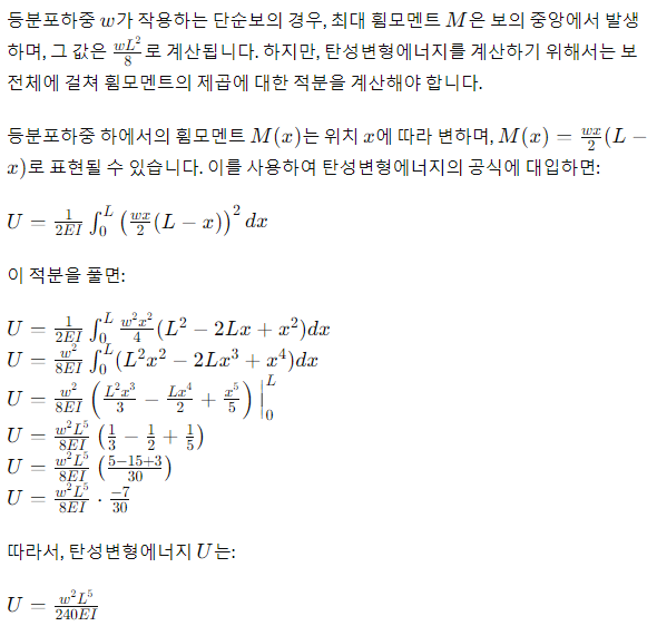 단순보에 등분포하중 (단위는 kN/m 또는 )이 작용할 때, 휨모멘트에 의한 탄성변형에너지는 다음 공식을 사용하여 계산할 수 있습니다: