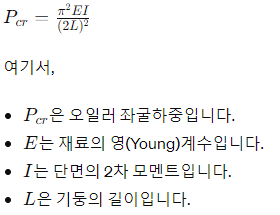 양단 고정: 양쪽 끝이 모두 고정되어 있는 경우, 기둥은 좀 더 안정적이고, 유효 길이는 실제 길이의 반으로 간주됩니다.