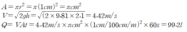 4. 유속계수가 0.82인 직경 2㎝의 표준단관의 수두가 2.1m일 때 1분간 유출량은?