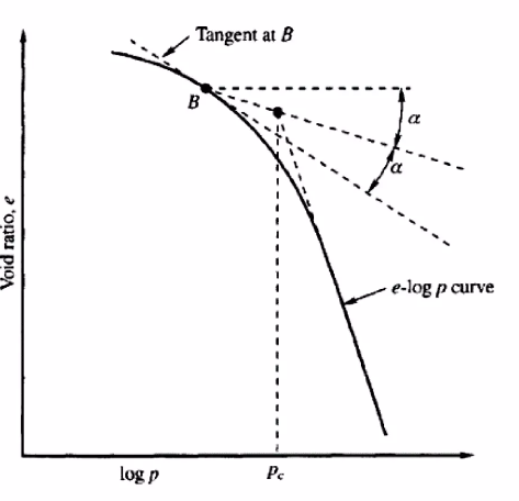 간극비 대 로그 압력 그래프에서는 압력이 증가함에 따라 간극비가 감소하는 경향을 보이는데, 선행압밀하중은 이 그래프상에서 간극비의 감소가 갑자기 둔화되는 지점, 즉 곡선의 경사가 변하는 지점에서 찾을 수 있습니다. 이 지점은 토양이 과거에 경험했던 최대 압밀하중을 나타내며, 그 이상의 압력에서 토양의 간극비 감소가 더욱 가팔라지는 특성을 보입니다.