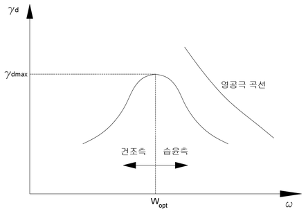 특징 조립토일수록 다짐 곡선은 급하고, 세립토일수록 다짐 곡선은 완만하다. 사질토에서는 최대 건조 밀도가 증가하고, 최적 함수비는 감소한다. 즉 곡선이 직교 좌표의 왼쪽 상방향에 그려지게 된다. 점토분이 많은 흙은 최대 건조 밀도가 감소하고, 최적 함수비는 증가한다. 즉 곡선이 직교 좌표의 오른쪽 하방향에 그려지게 된다.