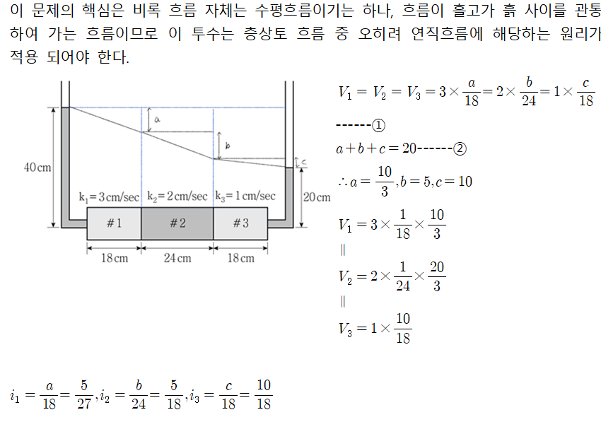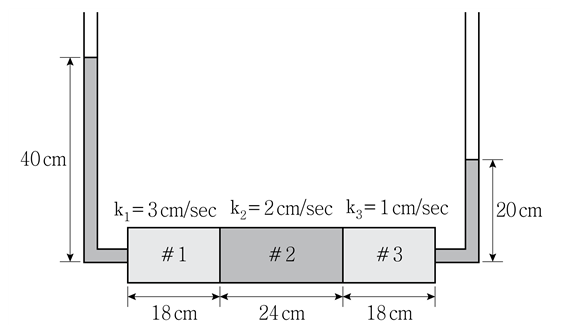 문 9. 그림과 같은 침투 조건에 대한 설명으로 옳은 것은? (단, 각 흙의 단면적은 일정하다)