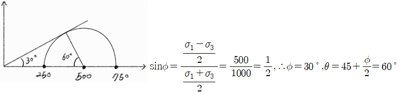 문 7. 순수 모래를 이용하여 250kPa의 구속압 상태에서 삼축압축시험을 수행하였을 때, 파괴 시 축차응력이 500kPa로 측정되었다. 이 시료의 내부마찰각과 수평면으로부터 파괴면의 각도는?