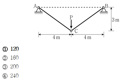 5. 그림과 같이 탄성 케이블의 중앙에 수직하중 P가 작용하는 케이블에 40MPa의 인장응력이 발생할 때, 수직하중 P의 크기[kN]는? (단, 케이블의 단면적은 2,500mm²이며, 케이블의 자중은 무시한다)