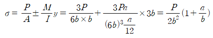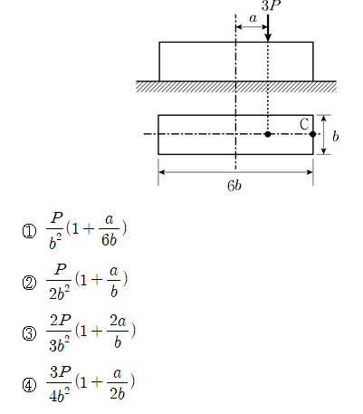 2. 그림과 같이 직사각형 단면을 가지는 단주가 있다. 도심으로부터 a만큼 일축 편심되어 수직하중 3P가 작용할 때, C점에서 발생하는 수직응력의 크기는? (단, 기둥의 자중은 무시한다)