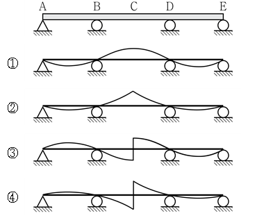 4. 그림과 같은 3경간 연속보에서 중앙점인 C점의 정성적인 휨모멘트의 영향선은? (단, 보의 휨강성 EI는 일정하다)