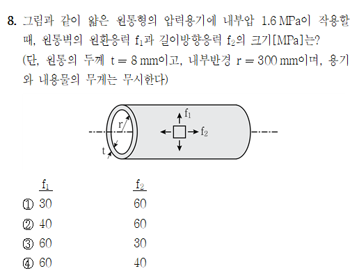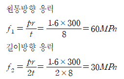 난이도 중, 얇은 원통형 압력용기의 내압에 의해 발생하는 원통방향 응력과 길이방향 응력