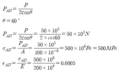 부재 AD에 작용하는 축 하중 P(AD)는 하중 P가 두 부재 AD와 BD에 분배된다는 점을 고려, 하중은 트러스의 대칭성과 각도에 따라 두 부재로 나누어지며, 부재 AD에 걸리는 하중은 다음과 같이 계산