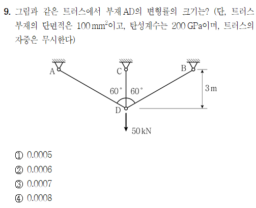 난이도 상, 트러스 구조에서 주어진 부재 AD의 변형률을 구하는 문제