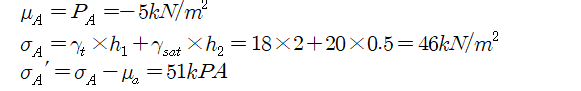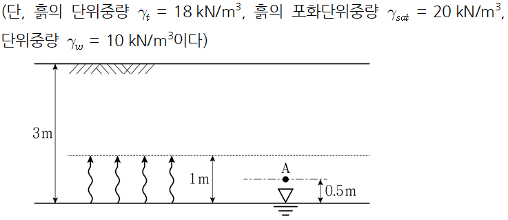 문 18. 그림과 같이 균질한 지층의 지표면으로부터 3m 아래 지하수위가 존재하고 있다. 지하수위면 상부 1m까지 모관작용에 의해 포화되어 있을 때, 지하수위면 상부 0.5m(A점)에서 유효응력은?