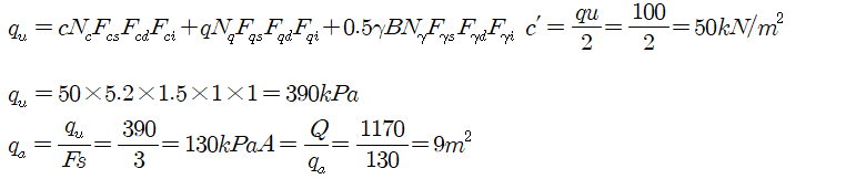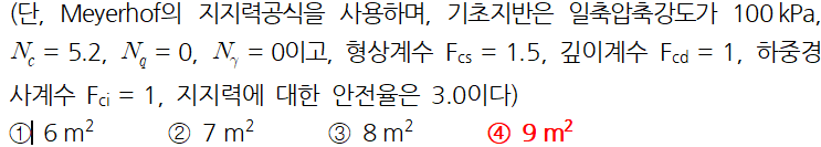 문 17. 비배수조건의 점성토지반에 사하중 500kN, 활하중 670kN을 지지할 수 있는 기초를 설치하고자 할 때, 필요한 기초의 면적은?
