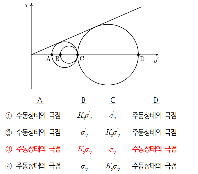 문 20. 그림은 벽체에 작용하는 토압상태를 Mohr원으로 표시한 것이다. Mohr원의 수직유효응력 축상의 A~D점의 의미를 옳게 정의한 것은? (단, C점은 정지상태일 때 수직유효응력이다)