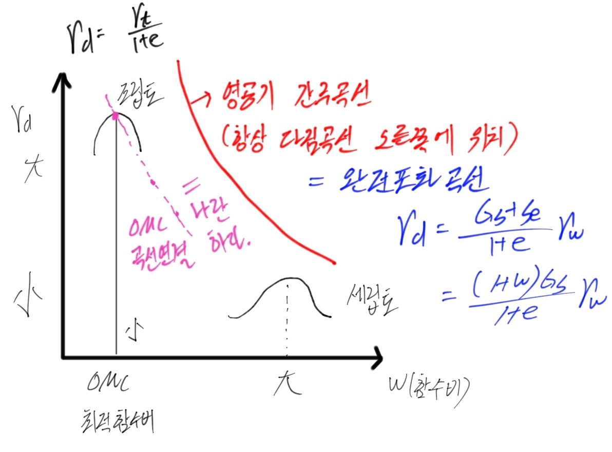 2) 영공기간극곡선은 항상 다짐곡선 오른쪽에 위치한다.